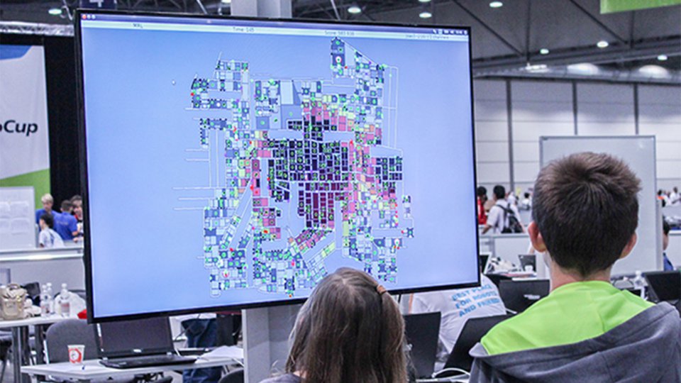 レスキューシミュレーションリーグ コンピュータ内に作られた市街地で大規模災害が発生したことを想定し、「エージェント」と呼ばれる救助隊や消防隊、道路警戒隊を導入して、市民などの要救助者を探して救助するシミュレータ内の競技です。 例えば、火事を消火する消防エージェント、建物から市民を救助する救急エージェント、壊れた道路を修復する土木(啓開)エージェント等が協力し、被災者の探索と救助を行います。被災地の災害状況は視覚情報、通信情報(音声・無線)、各エージェント自身が取得した情報です。火災の状況や、建物の中に要救助者がいるかどうかはエージェントが近付いて確認する必要があります。通信情報は実際の災害現場と同様、音声と無線通信です。音声はエージェント同士が声で状況や意思を伝達したり、要救助者が助けを呼ぶ声などです。無線は救助センターと救助エージェント、その他のエージェントが通信によって共有できる情報です。 火災も温度、燃焼度、倒壊度などの数値が与えられ、数値は順次変わっていき、延焼した家屋が燃え尽きたり、近隣の建物に飛び火、建物の倒壊など、災害は進行していきます。市民も自力で歩いて避難所に向かう人もいて、その場合は倒壊した道路を修復して安全な避難路を確保することが重要となります。 参考動画(協力:愛知工業大学) ルールが解りやすく解説されています
